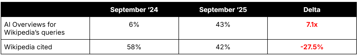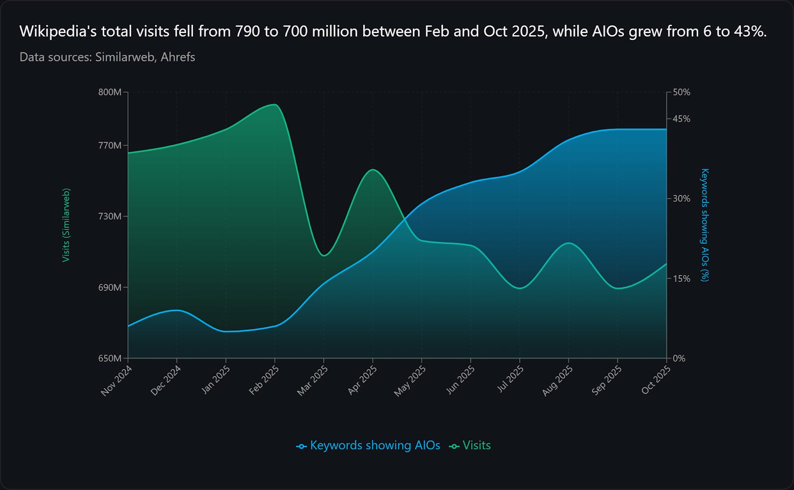 با اینکه ترافیک مستقیم ویکیپدیا حدود ۲۳٪ و ورودیهاش از ChatGPT حدود ۳.۵ برابر نسبت به سال قبل بیشتر شده، اما ورودیهاش از گوگل ۳۵٪ کاهش پیدا کرده. دلیلش اینه که «نمای کلی هوش مصنوعی» (AI Overviews) گوگل، دیگه نیازی به کلیک کردن روی لینکها برای کاربرها باقی نمیذاره.