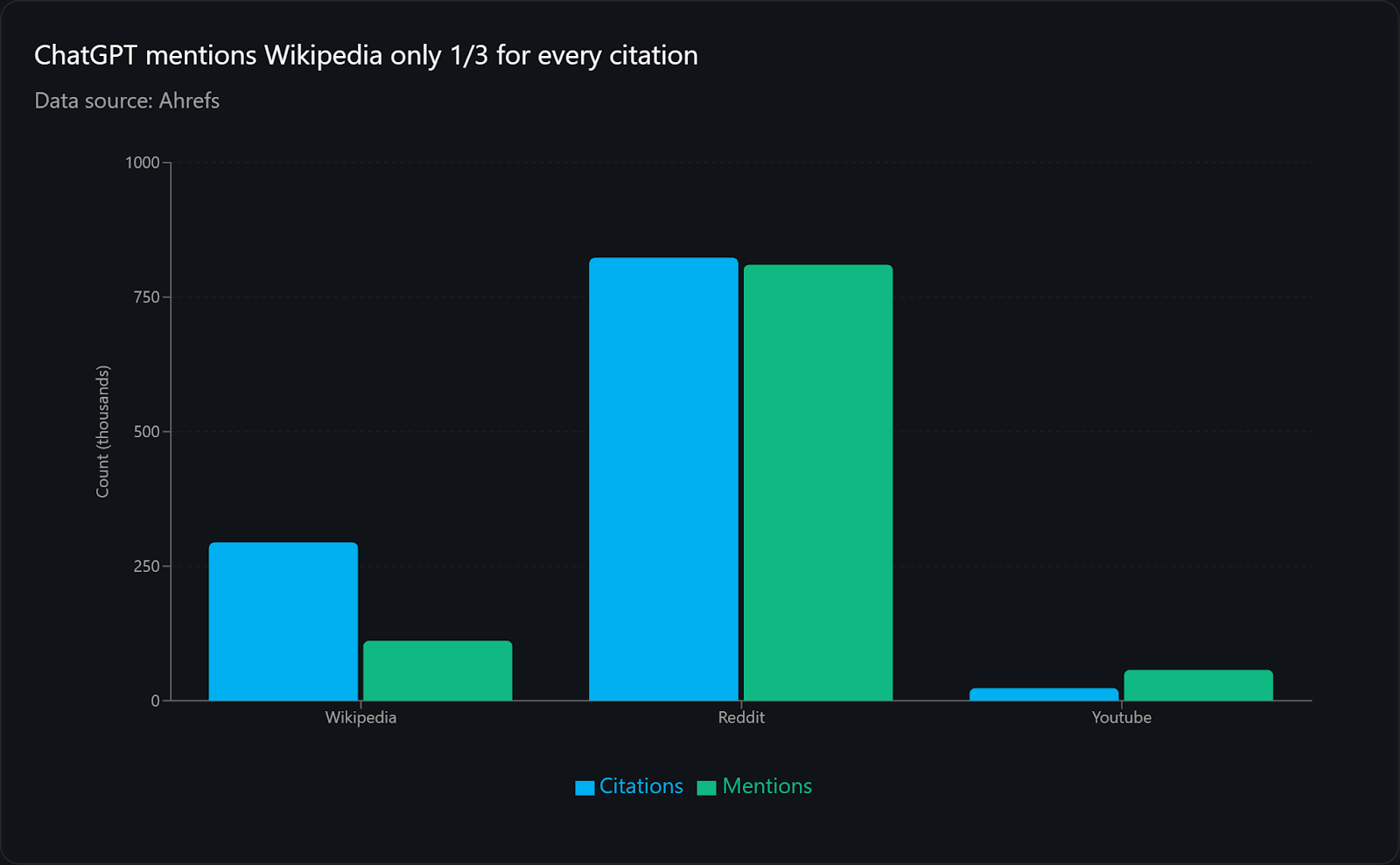 ChatGPT سه برابر بیشتر از اینکه به ویکیپدیا «اشاره» کنه، بهش «استناد» میکنه. در حالی که این نسبت برای ردیت یک به یکه و برای یوتیوب حدود ۲۵۰٪! از اونجایی که کاربرها روی لینکهای استناد کلیک نمیکنن، «اشاره» یا همون منشن شدن خیلی باارزشتره.