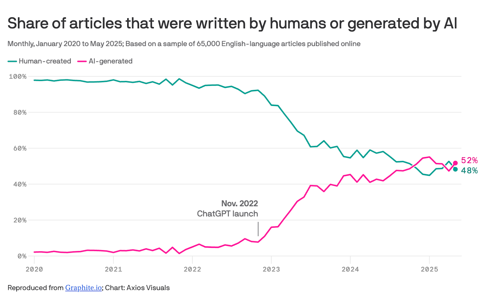 یکی از نشانههای واضح این تغییر، رشد انفجاری محتوای تولید شده با هوش مصنوعیه. Graphite.io و Axios گزارش دادن که تعداد مقالاتی که با هوش مصنوعی نوشته شدن، حالا از مقالاتی که توسط انسانها تولید شدن، پیشی گرفته.