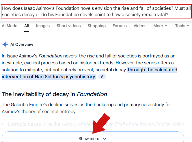 اسکرینشات بالا یه جستجوی پیچیده دو جملهای رو نشون میده که تو باکس جستجوی گوگل وارد شده. این جستجوی پیچیده بهطور خودکار یه پیشنمایش از حالت هوش مصنوعی (AI Mode) رو فعال میکنه که یه لینک «نمایش بیشتر» (Show more) هم داره. با کلیک روی این لینک، کاربر وارد یه تجربه جستجوی مکالمهمحور و جذاب در حالت هوش مصنوعی میشه. ناشرانی که میخوان محتواشون به عنوان منبع نمایش داده بشه، باید فکر کنن که چطور میتونن محتواشون رو با این فضا هماهنگ کنن.