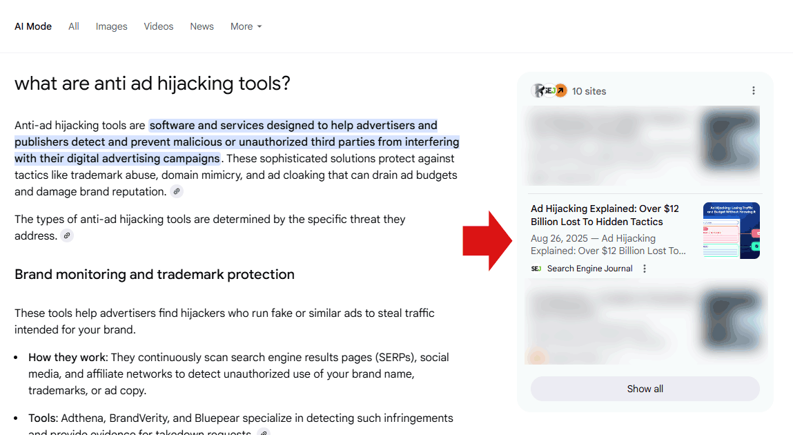 در پایین، اسکرینشات یه پست اسپانسری رو میبینین که توسط گوگل ایندکس شده و برای عبارت کلیدی «ابزارهای ربودن تبلیغات (ad hijacking) چیست» در AI Mode رتبه گرفته.