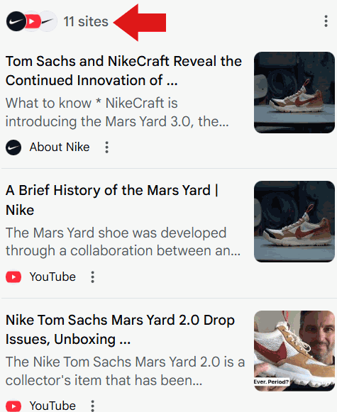 اسکرینشات پایین نشون میده که چطور نایکی با محتوای متنی و ویدیویی، کنترل مکالمه رو در AI Mode به دست گرفته.