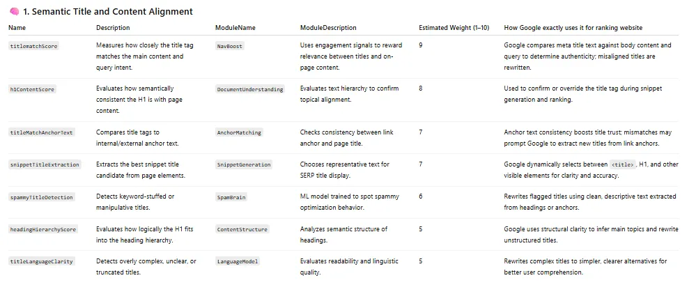 در نهایت، «بهترین» تایتل از بین عناصر داخل صفحه از طریق snippetTitleExtraction انتخاب میشه. در حالی که گوگل عمدتاً از تگ تایتل یا H1 استفاده میکنه، هر عنصر قابل مشاهدهای میتونه استفاده بشه اگه «بهترین نماینده صفحه» باشه.