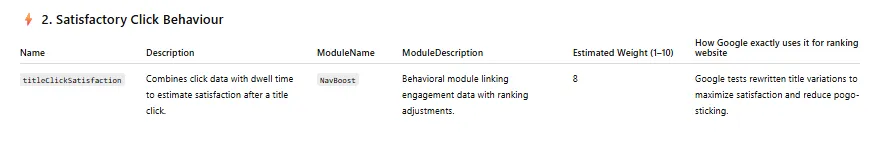 مثل همیشه، کلیکها یک سیگنال فوقالعاده قدرتمند هستن. گوگل بیشتر از تعداد وعدههای غذایی که من خوردم نقطه داده داره، پس ایدههای خیلی خوبی در مورد اینکه چه چیزی خوب عمل میکنه، داره. اما کلیکهای واقعی میتونن این رو نادیده بگیرن. متریک goldmineNavboostFactor اثبات میکنه که رفتار کلیک روی اینکه کدام تایتل نمایش داده بشه، تأثیر داره.