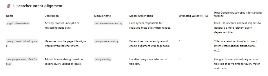 و تایتلهای صفحه در سطح کوئری بازنویسی میشن. متریک queryIntentTitleAlignment میزان همراستایی تایتل صفحه با قصد کاربر از جستجو رو اندازهگیری میکنه. وقتی این موضوع مشخص شد، همراستایی صفحه و قصد کوئری بررسی میشه تا اطمینان حاصل بشه که تایتل بهترین بازتابدهنده صفحه در سطح کوئری است.