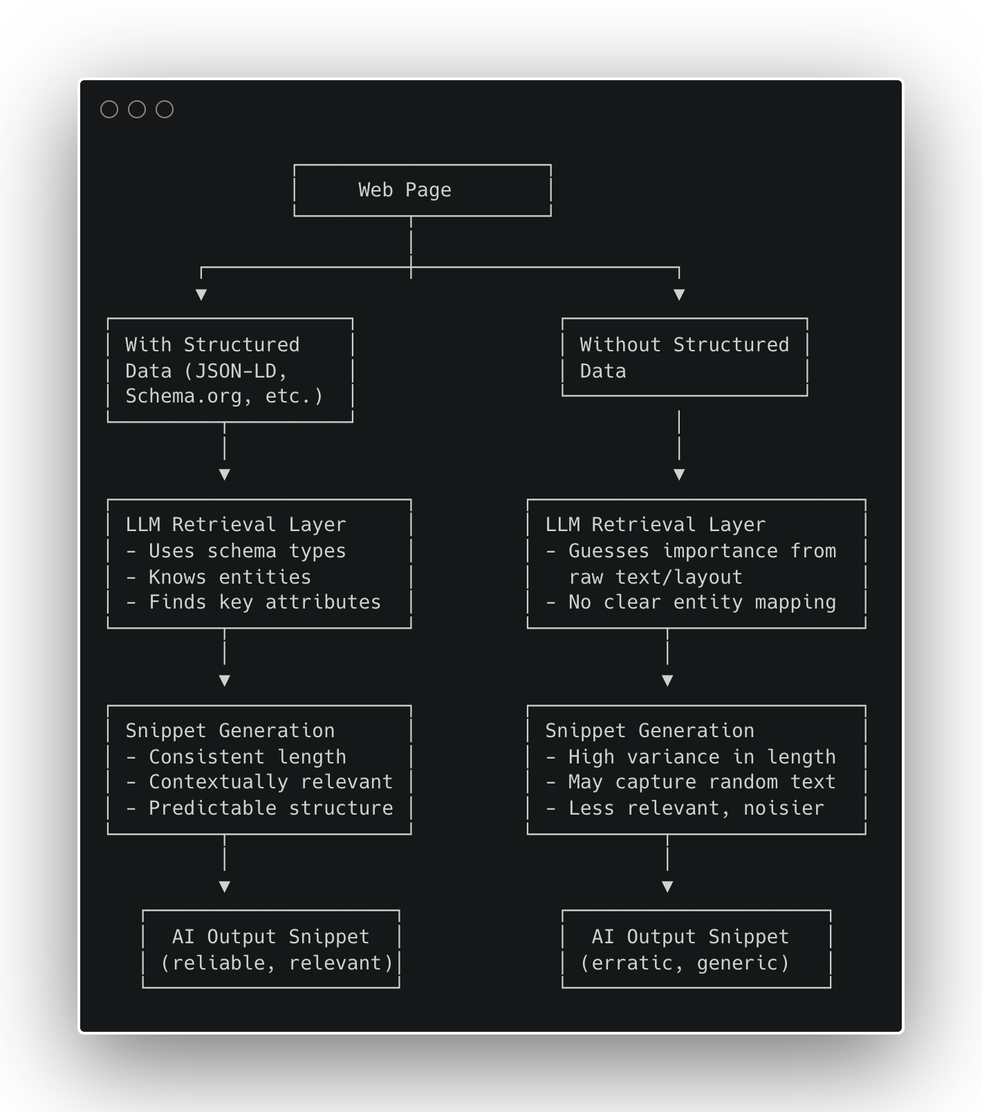 تفسیر: دادههای ساختاریافته طول اسنیپت رو زیاد نمیکنه؛ بلکه عدم قطعیت رو کاهش میده. مدلهای هوش مصنوعی به جای حدس زدن از روی کدهای HTML نامشخص، به سراغ حقایق ساختاریافته و امن میرن.