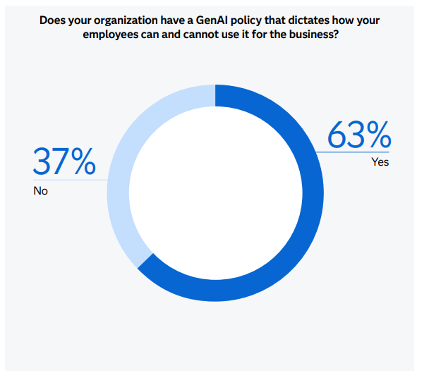 اما ۶۳ درصد شرکتها روی تدوین سیاستنامههایی سرمایهگذاری میکنن که نحوه استفاده از هوش مصنوعی مولد رو در کل سازمان مشخص میکنه.