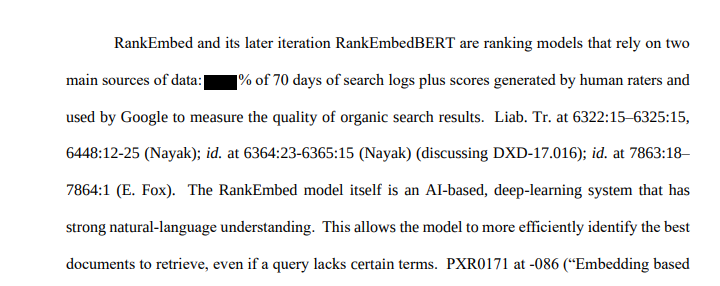 - «RankEmbed و نسخه بعدی اون RankEmbedBERT، مدلهای رتبهبندیای هستن که به دو منبع اصلی داده متکیان: [بخش حذف شده] درصد از لاگهای جستجوی ۷۰ روزه به علاوه امتیازهایی که توسط ارزیابهای انسانی تولید شده و گوگل برای سنجش کیفیت نتایج جستجوی ارگانیک از اونها استفاده میکنه.»