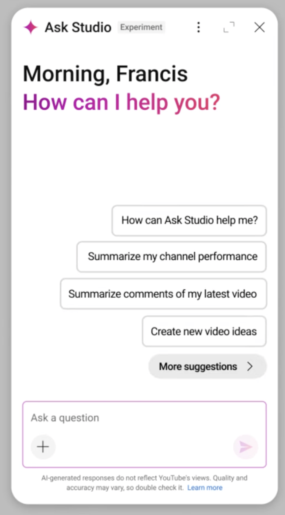 Ask Studio یه ابزار محاورهایه که به شما اجازه میده با زبان ساده و خودمونی، سوالاتتون رو در مورد آمار کانال بپرسید تا بفهمید چه چیزهایی خوب جواب میده و دلیلش چیه.